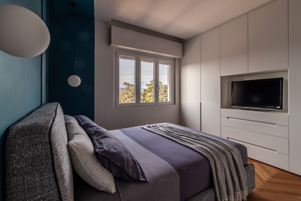 I pilastri presenti ai lati della finestra della zona giorno, sporgono dal muro perimetrale all’interno della stanza: sono diventati l’occasione per costruirvi attorno due volumi contenitivi. Dal lato verso la cucina un pratico ripostiglio, dal lato verso l’ingresso un vano scarpiera. Al centro, dietro al divano, un vano con apertura dall’alto. Nessuno spazio viene sprecato.