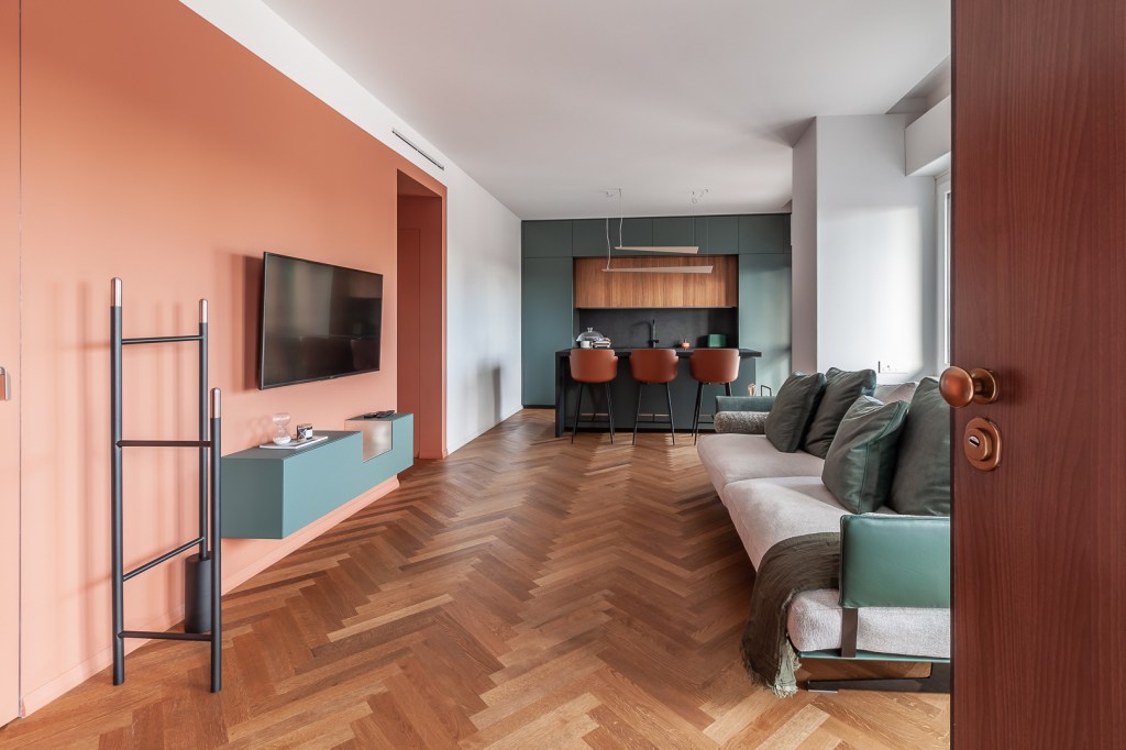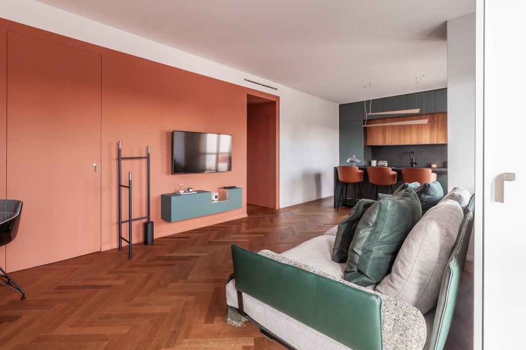 La tinteggiatura terracotta avvolge la zona TV, ingloba il vano del disimpegno e nasconde la porta di accesso allo studio: tre funzioni perfettamente raccordate.