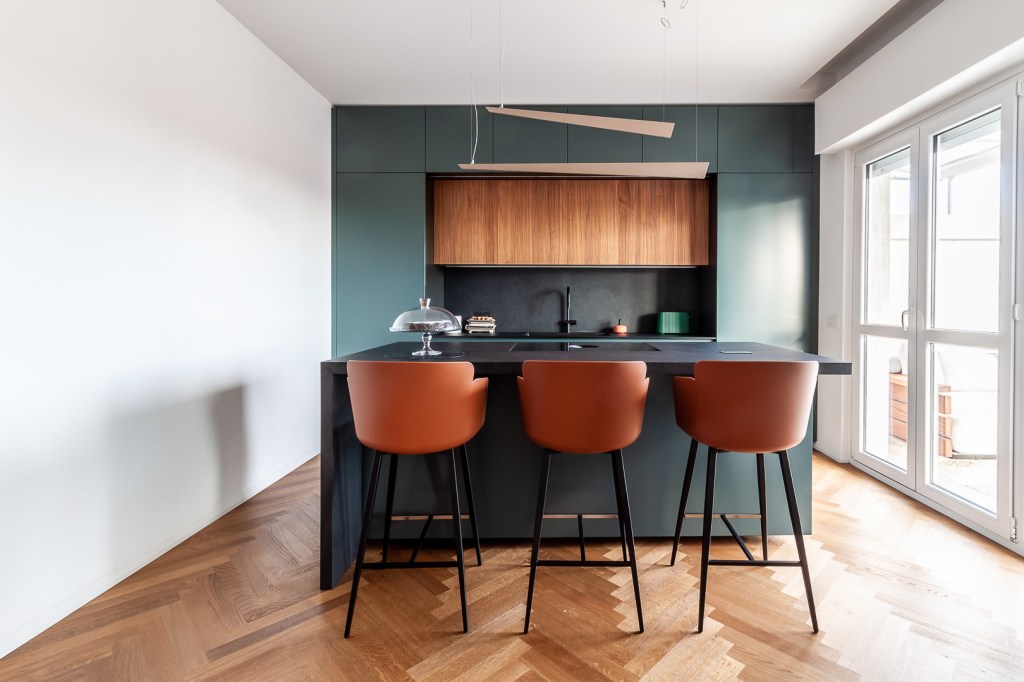 La cucina verde scuro si staglia sulla parete di fondo, ponendosi come fondale ad effetto per la zona giorno.
