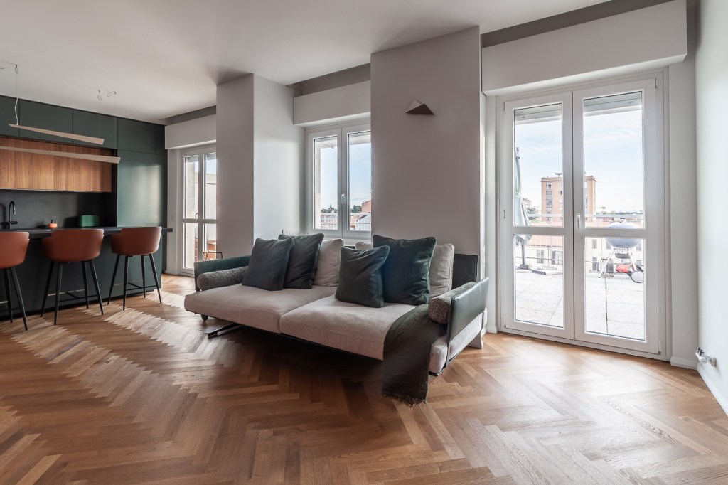 Un appartamento scelto per la visuale sulla città e la grande terrazza soleggiata.