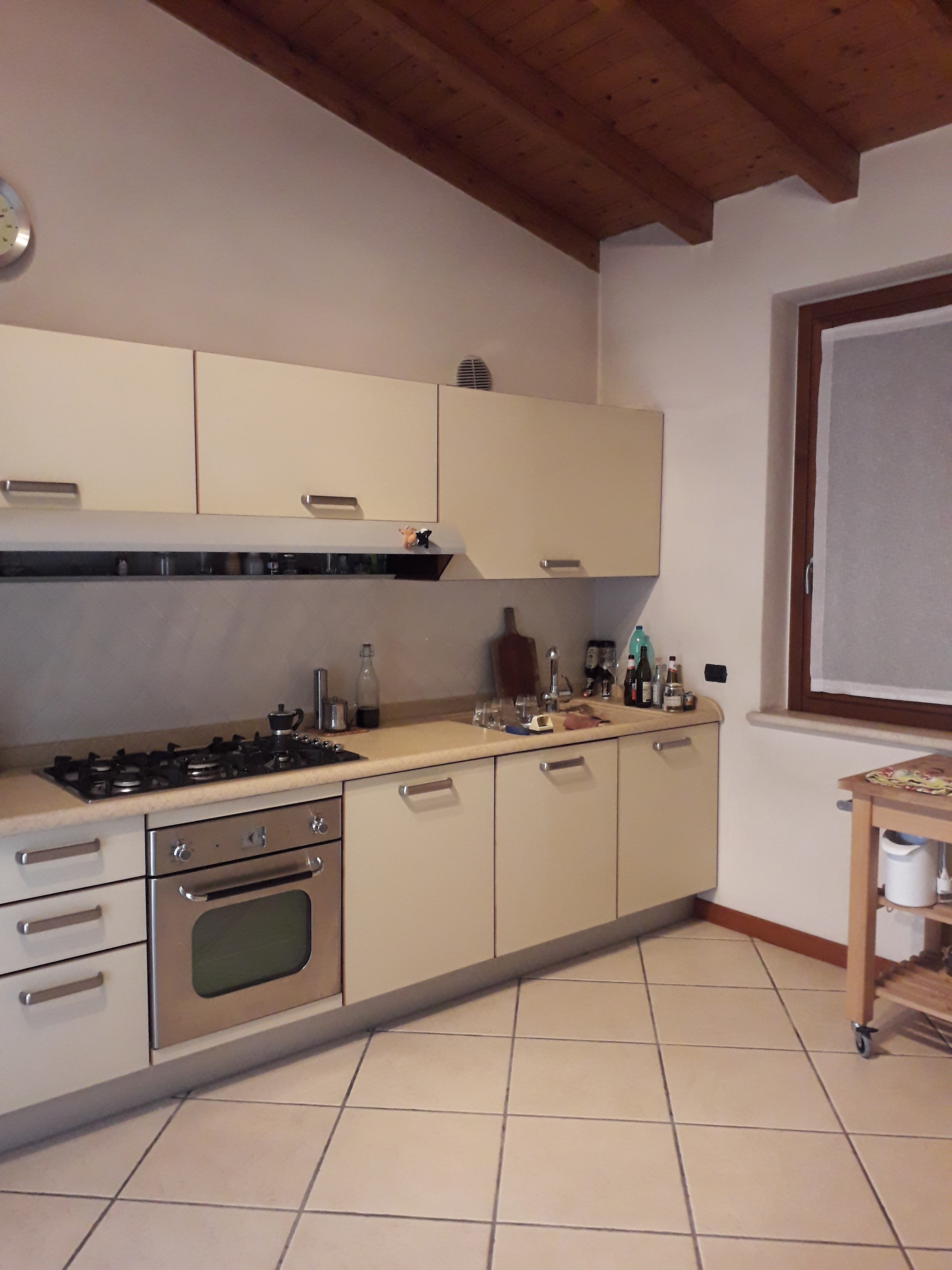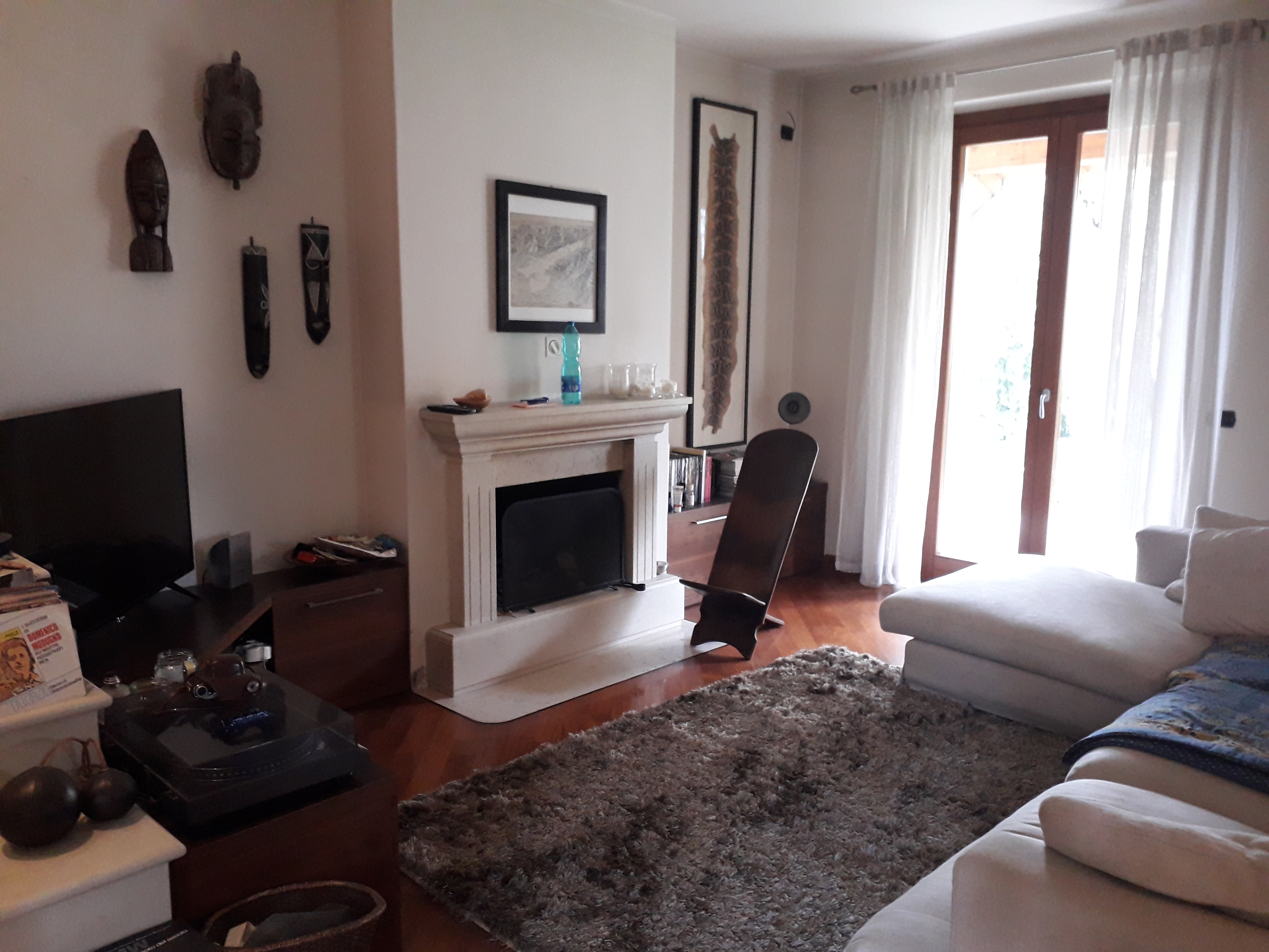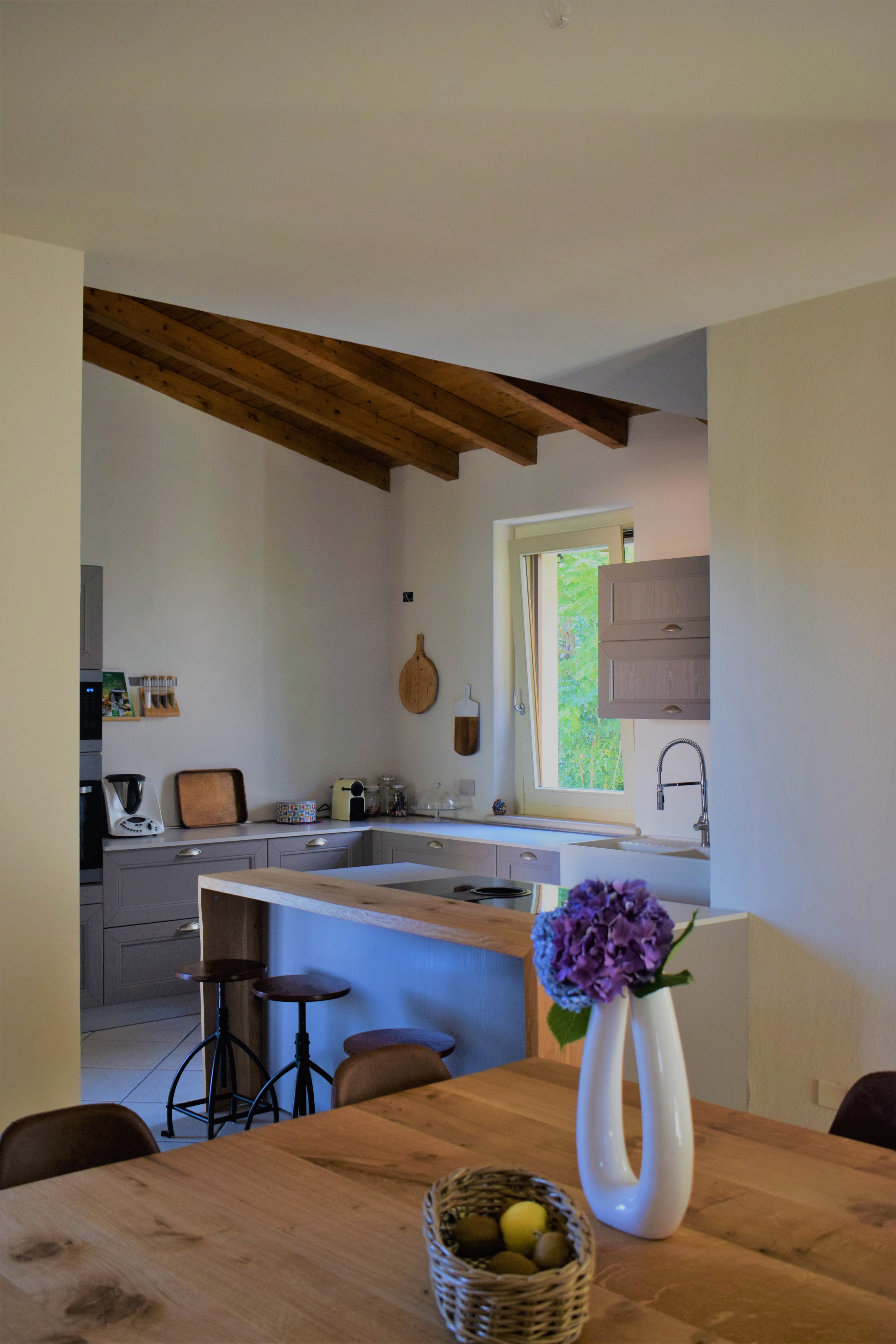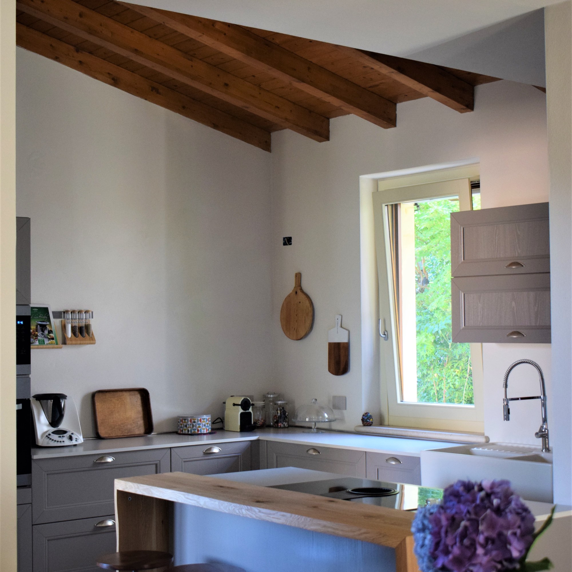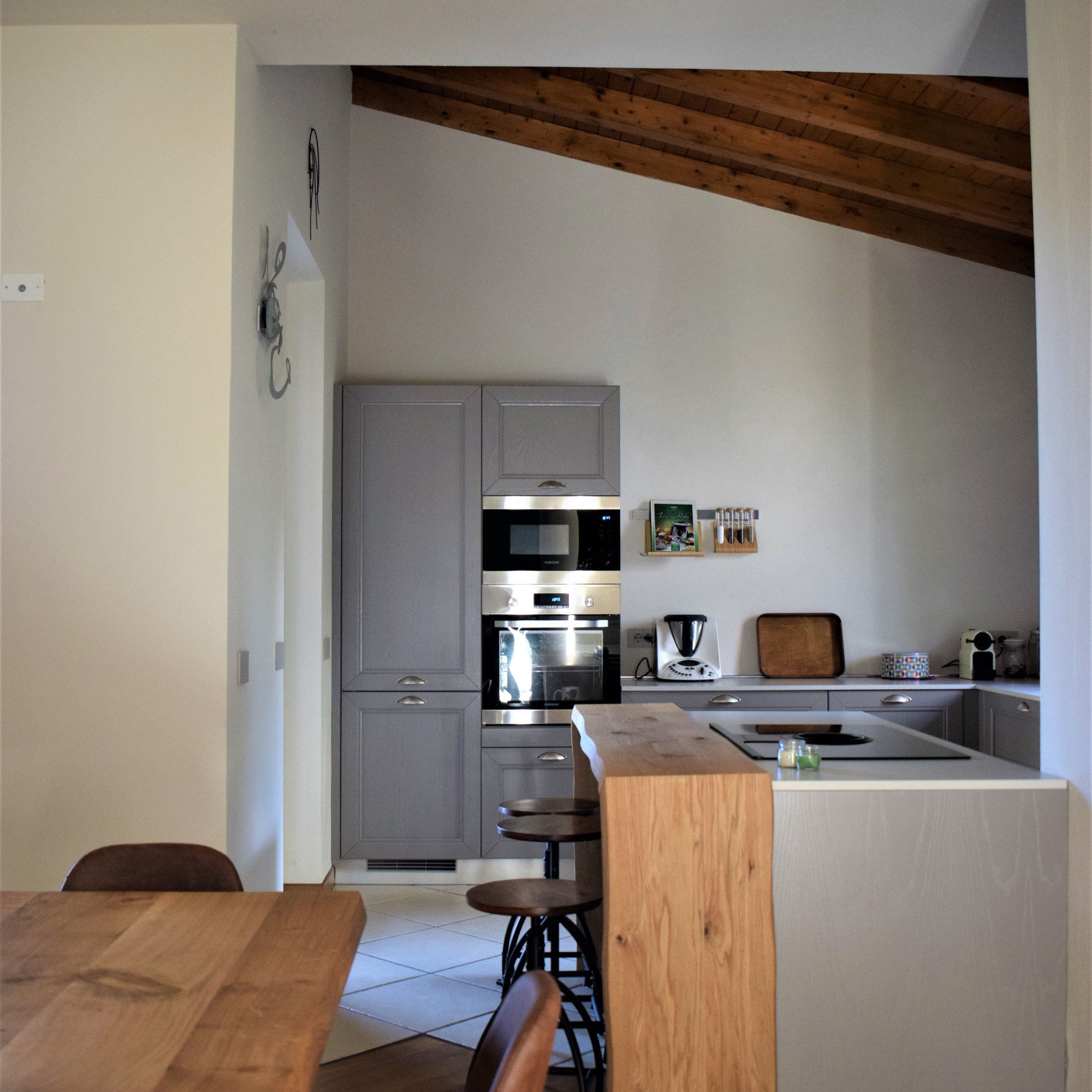 Ho conosciuto Elisabetta e Corrado quando avevano appena acquistato casa, una graziosa villetta su tre piani immersa in un piccolo angolo di paradiso verde sul lago di Garda. L’abitazione presentava già degli elementi architettonici interessanti da valorizzare e sui quali lavorare, ad esempio le travi in legno a soffitto, un pilastro tondo nella zona living, un bellissimo caminetto dal gusto antico, una parete rivestita in pietra e un soppalco.