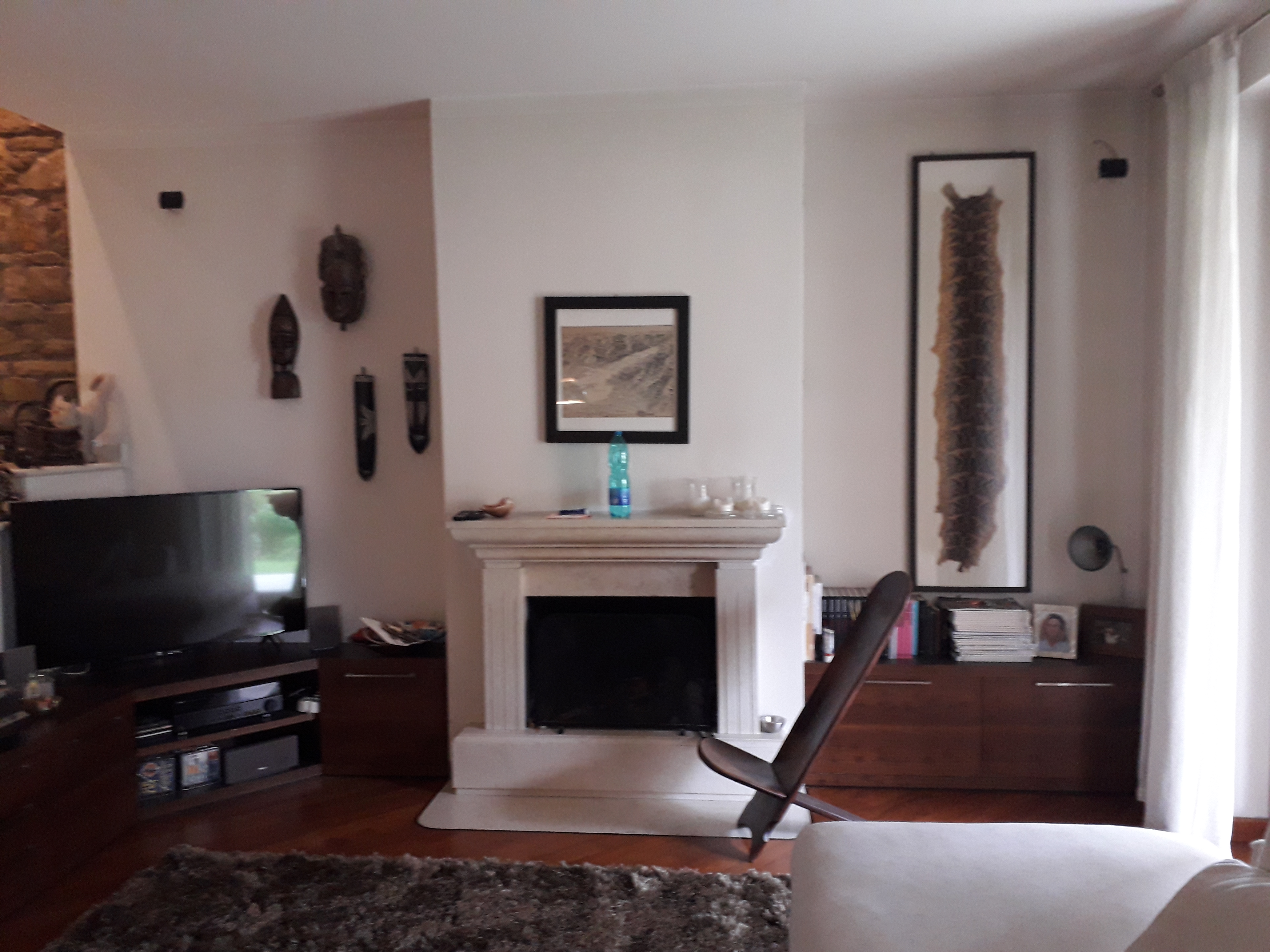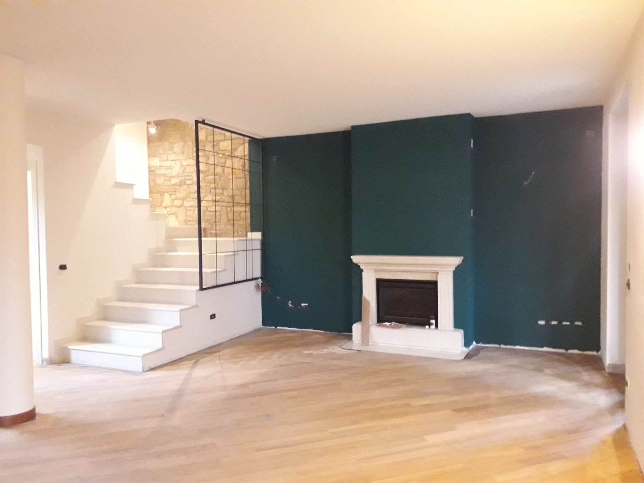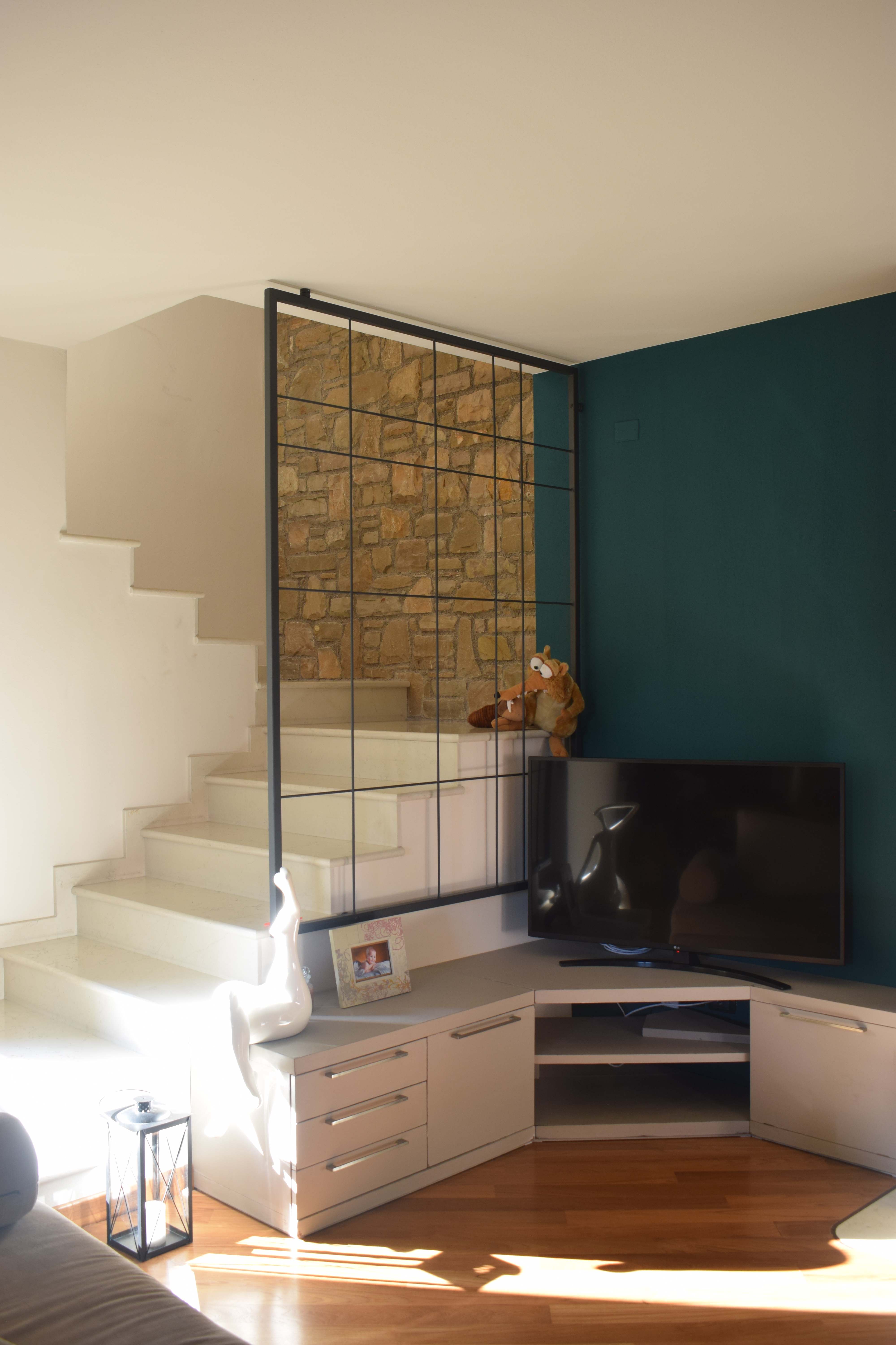 Il soggiorno aveva un gusto vagamente coloniale, maschere lignee africane appese alle pareti non valorizzavano il caminetto e sia l’arredo, sia la pavimentazione in parquet, risultavano troppo scuri e incupivano l’ambiente. L’idea: levigare il parquet rendendolo più chiaro, decapare e rinnovare l’arredo, tinteggiare la parete di fondo del salotto con un colore d’impatto per far risaltare il caminetto e renderlo l’assoluto protagonista dell’ambiente, prevedere una schermatura in stile industrial per la scala aperta che porta al secondo piano.