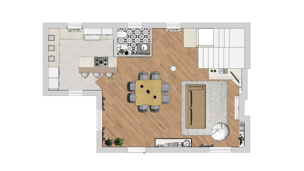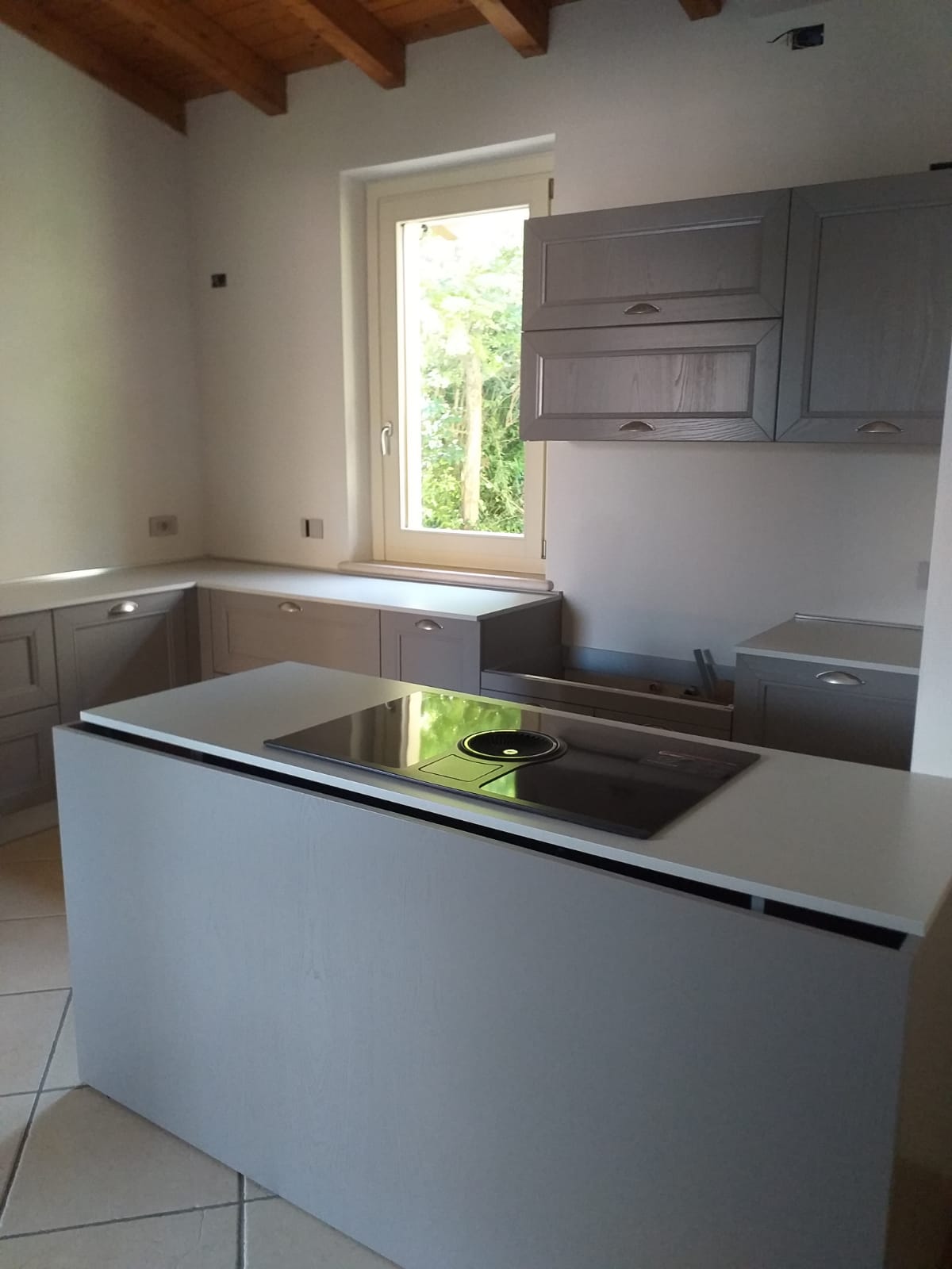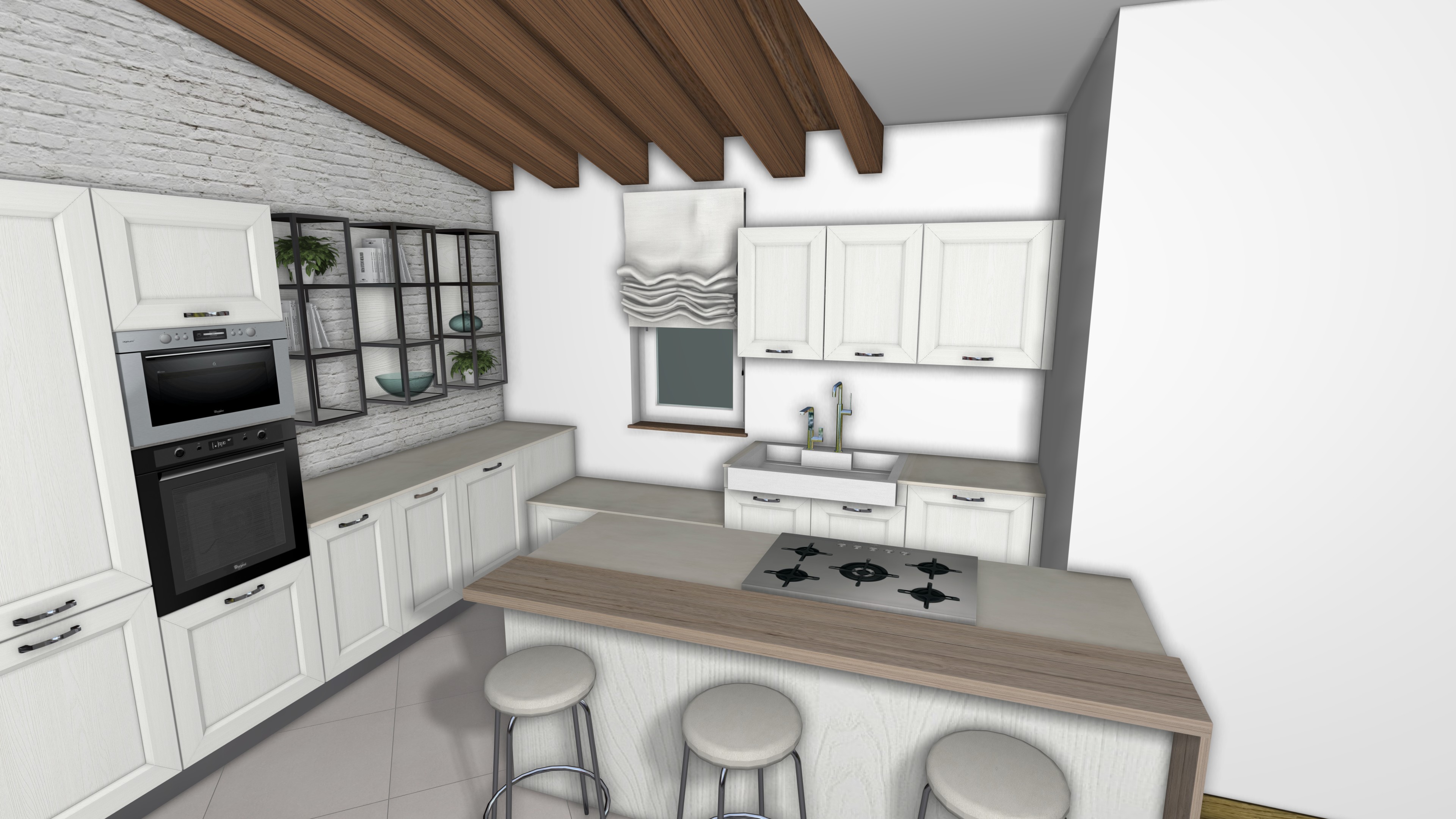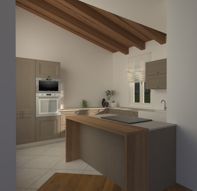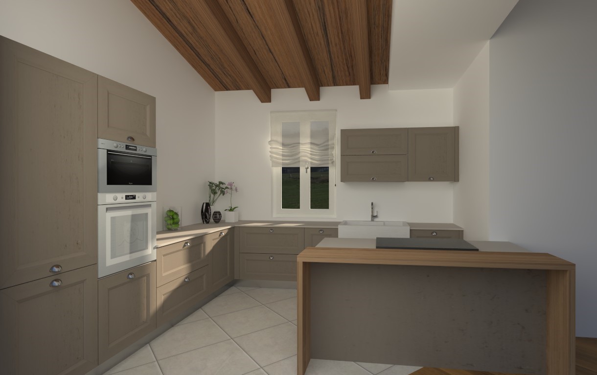 Il progetto finale della cucina: una composizione funzionale che sfrutta in modo sapiente lo spazio e si connette con elementi di continuità al grande soggiorno