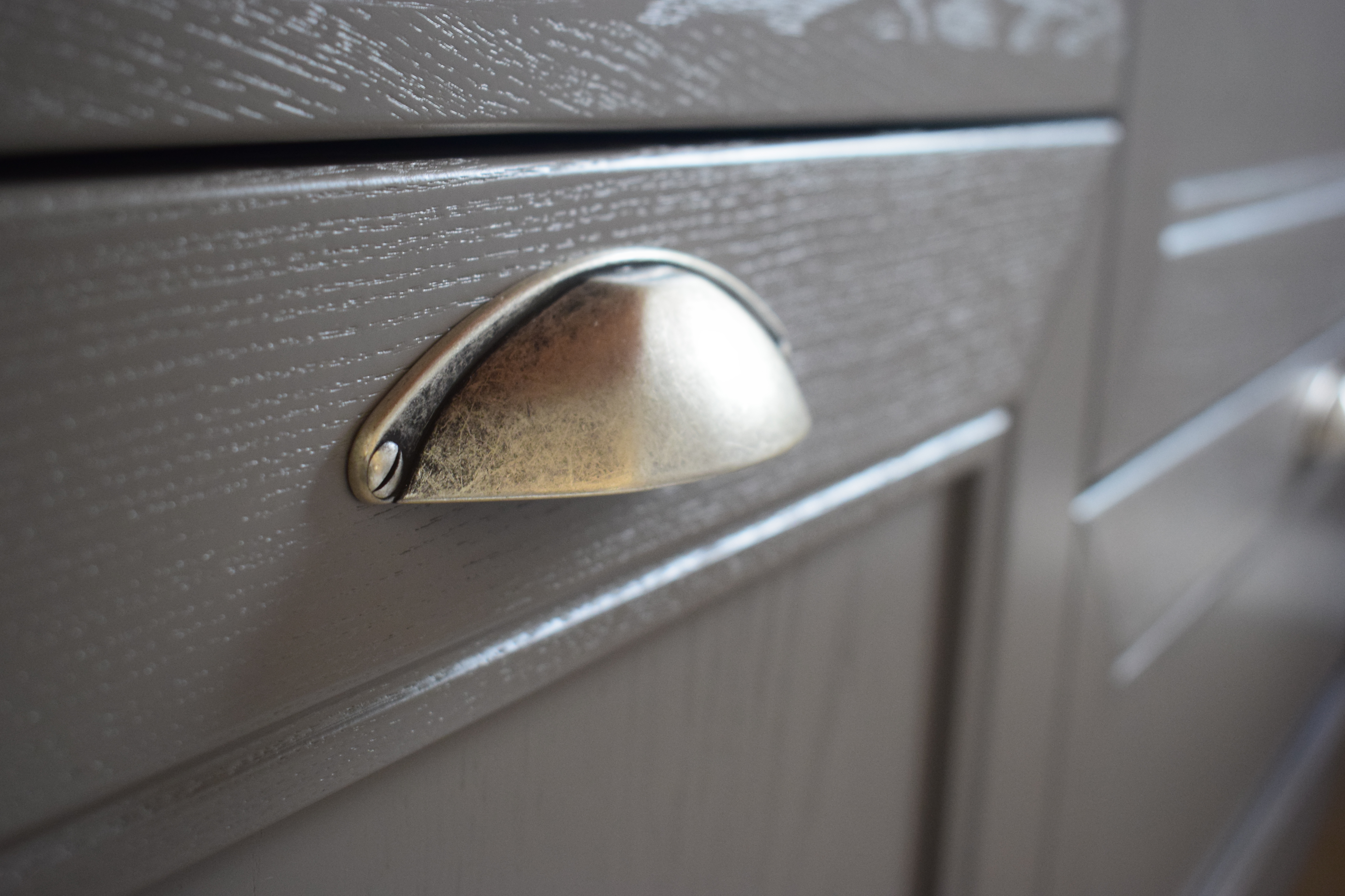 Le finiture della cucina, l’anta a telaio in finitura laccato poro aperto argilla e l’utilizzo di una maniglia a conchiglia in metallo effetto invecchiato, concorrono ad enfatizzare lo stile “rustrial” di tutta la casa.