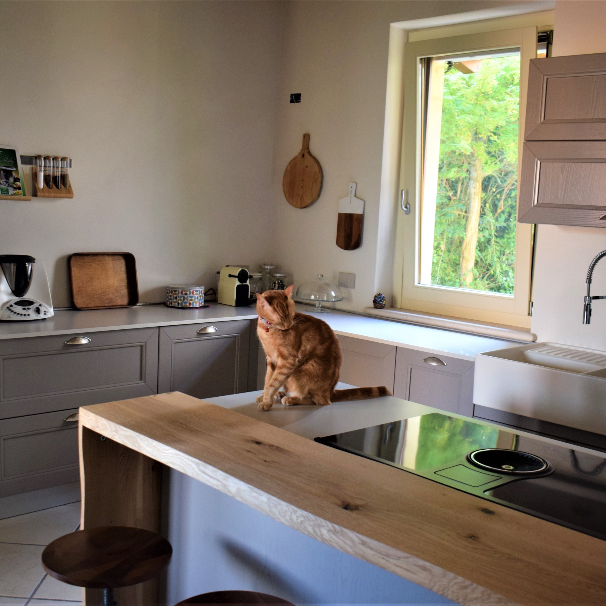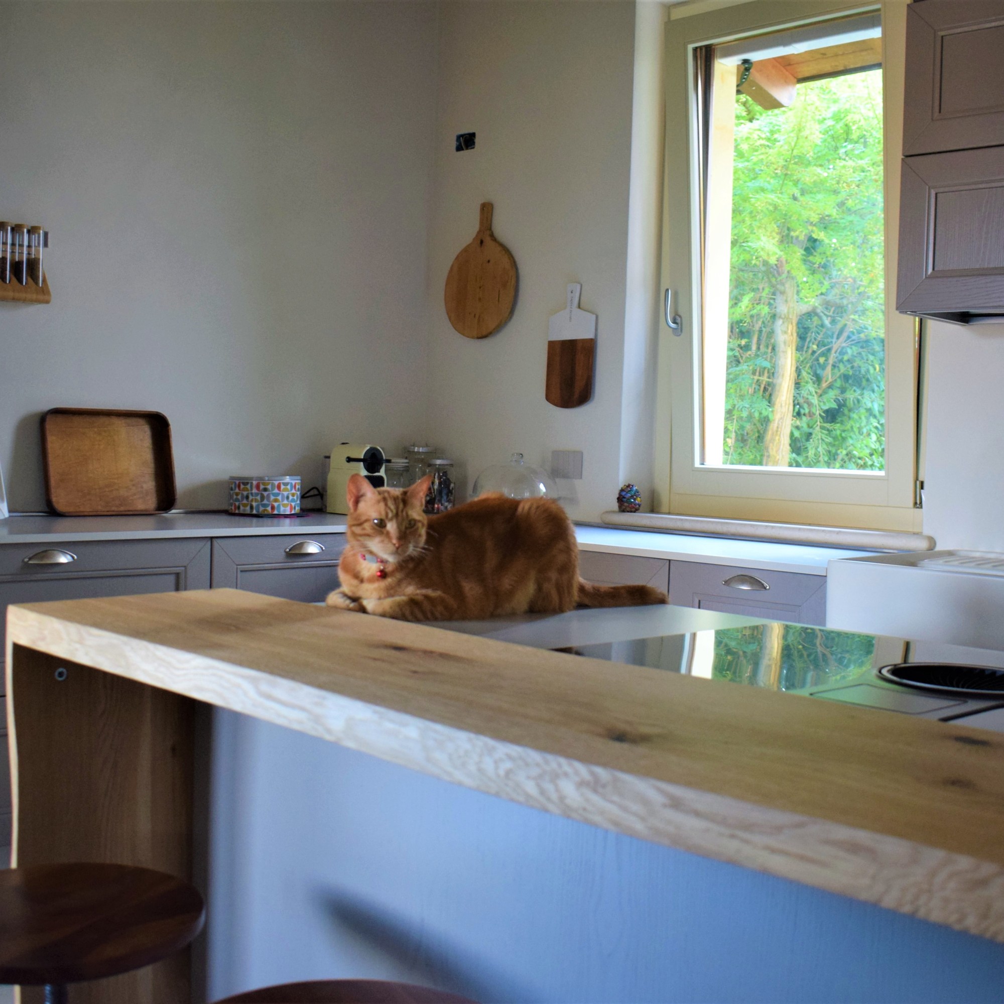 Anche Birra, il gatto rosso tigrato di Elisabetta e Corrado, sembra apprezzare la nuova cucina, in particolar modo la penisola sulla quale Corrado si diletta a cucinare deliziose ricette per tutta la famiglia.