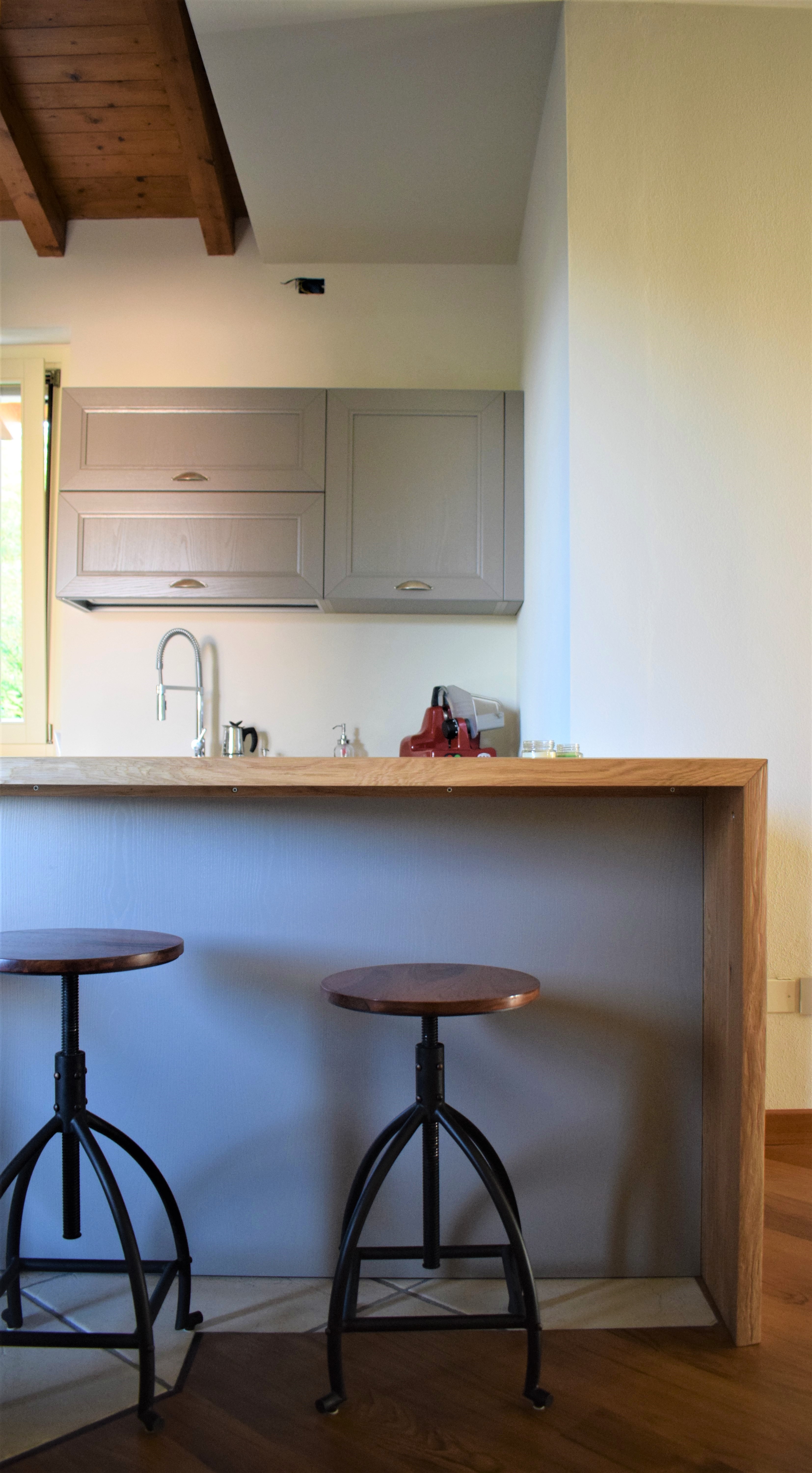 La penisola funzionale in cui si colloca il piano cottura ad induzione con cappa integrata è parallela alla zona lavello, così da risultare comoda, pratica e raggiungibile con un solo movimento. Completa la composizione il piano snack composto secondo uno schema trilitico (due stipiti verticali su cui poggia un’architrave orizzontale) con giunzioni a 45°; questo piano dallo spessore di 4 cm è in rovere massello con finitura scortecciata, in modo da risultare un elemento in linea con lo stile rustico del progetto.