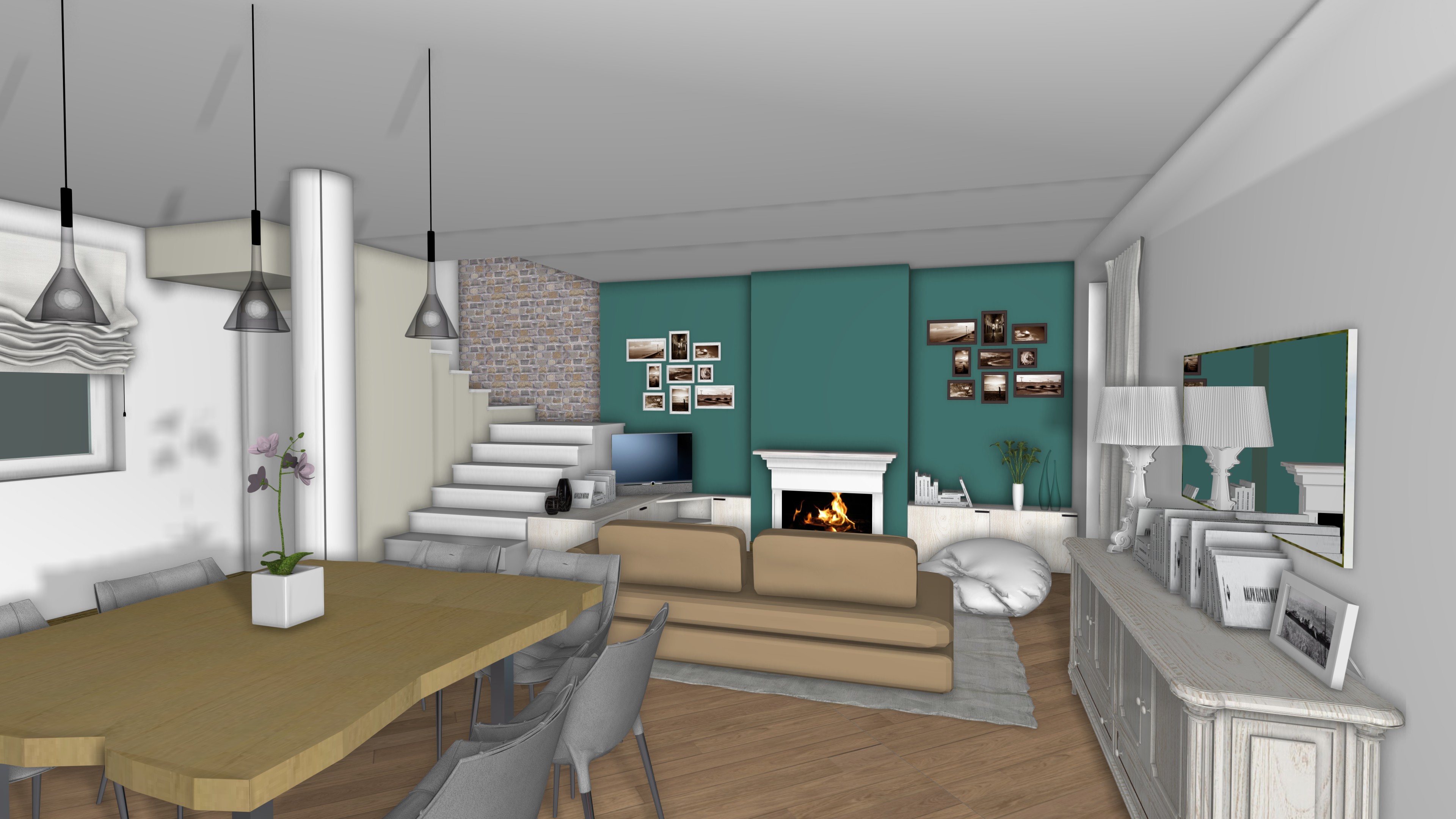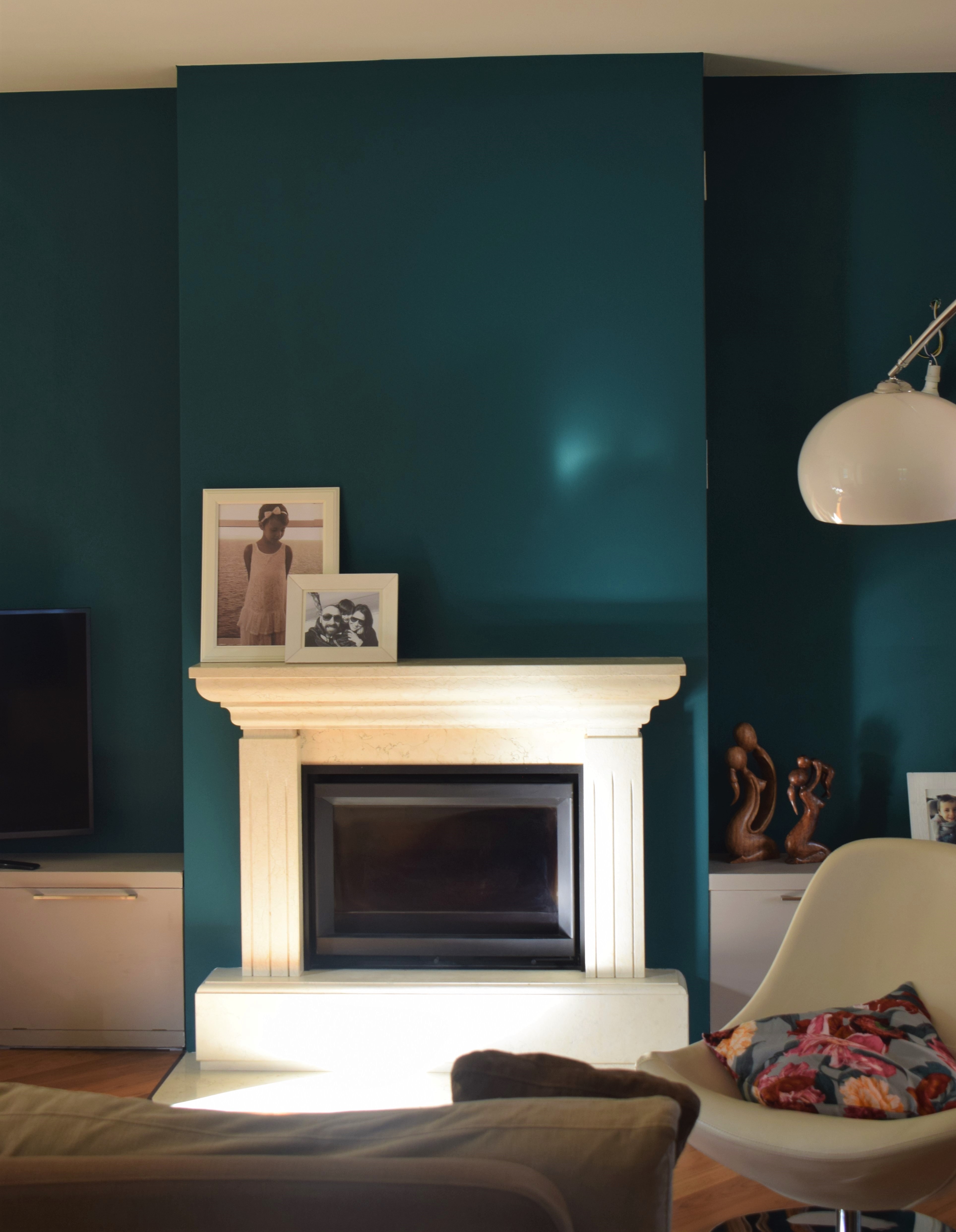 La zona living è accanto allo spazio destinato alla sala da pranzo e con piccoli ma mirati interventi di restyling assume un’identità completamente differente rispetto alla sua connotazione iniziale. Il mobile TV su misura mantenuto dall’arredo precedente è stato carteggiato, decapato e ritinteggiato con una nuance nocciola in accordo con la credenza dal sapore rustico che Elisabetta e Corrado possedevano già. La parete di fondo del soggiorno prende vita e si trasforma in un tripudio di colore grazie ad una gradazione di ottanio; così facendo il caminetto antico bianco viene inquadrato all’interno dello spazio e risalta in modo netto.