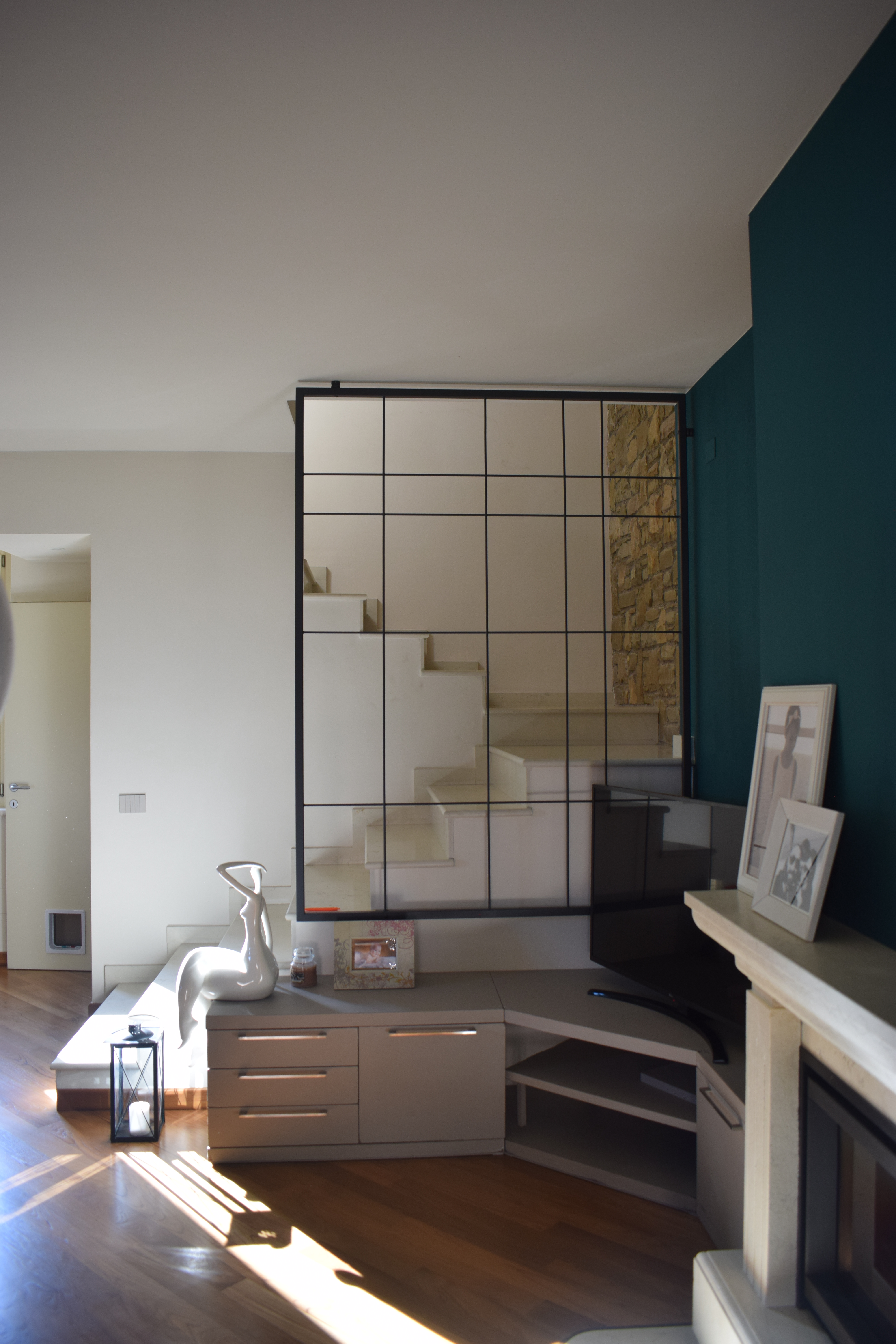 La struttura in metallo ha una doppia funzionalità: schermare e proteggere la scala in marmo, caratterizzare l’ambiente con un elemento di design in stile industriale.