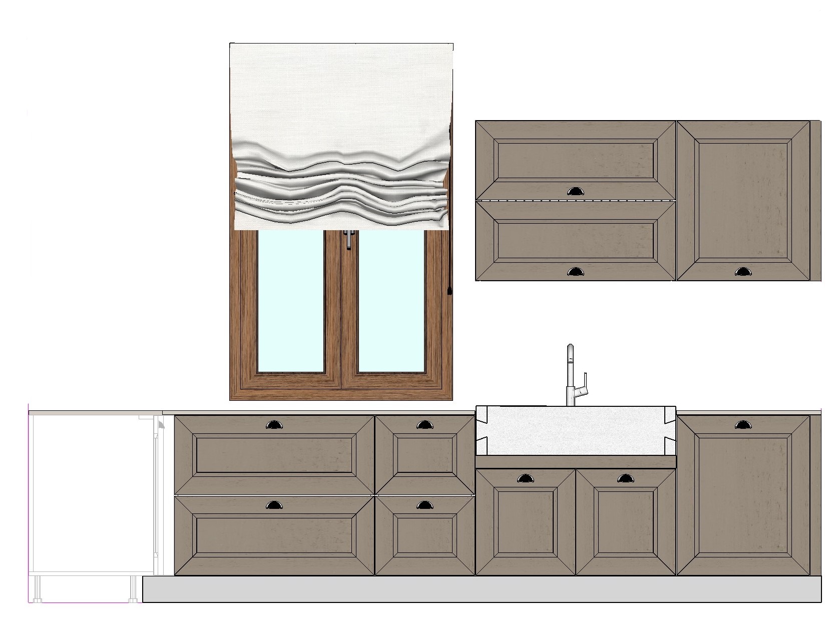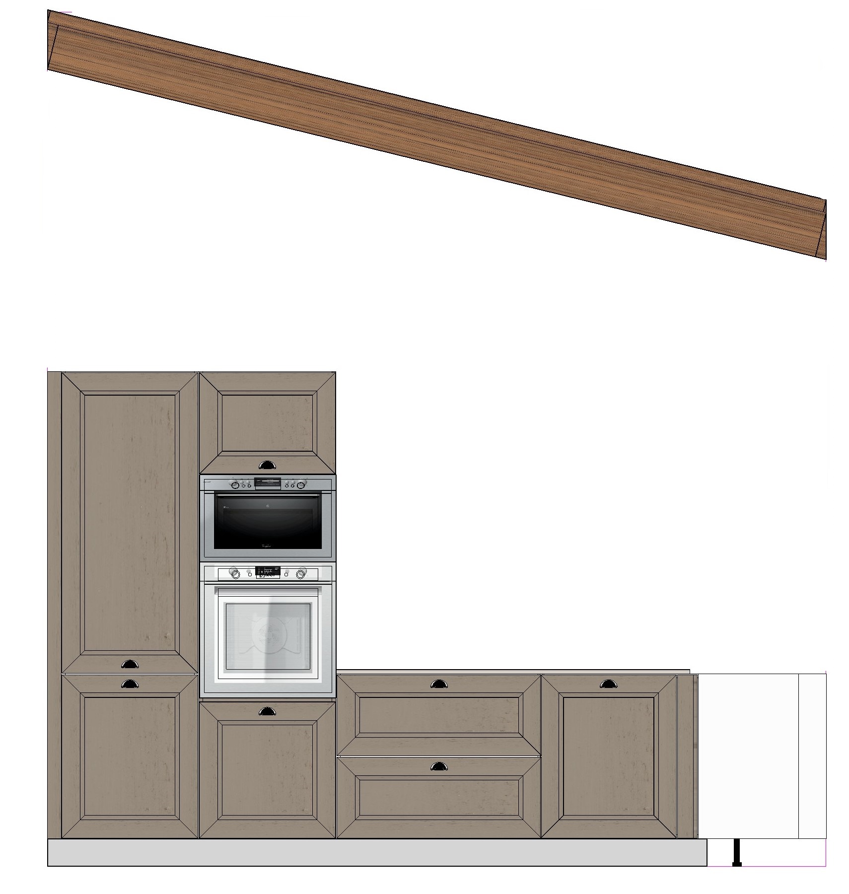 Prospetti della cucina: la zona della colonne, la parte angolare con i cestoni che termina con il lavello in ceramica, la penisola con il piano snack.