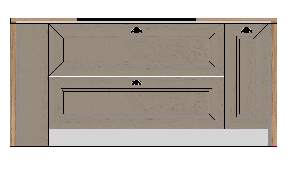 Immagini a confronto: render di progetto e fotografia della cucina realizzata e montata.