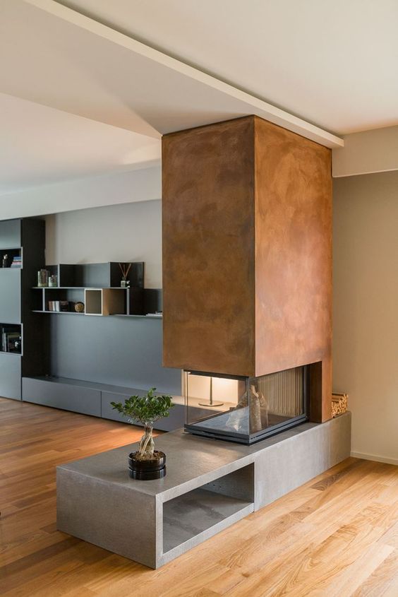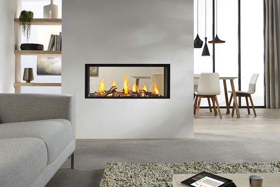 - Bifacciale e trifacciale. Sono modelli incassati nella parete che divide due stanze, o un unico grande ambiente, oppure in una quinta o un “pilastro” centrale. Oltre ad avere una funzione divisoria, assumono un aspetto scenografico, in grado di caratterizzare molto l’arredo e gli interni in generale. I modelli bifacciali o passanti – ovvero con il focolare da parte a parte – utilizzano bracieri dotati di doppio vetro ceramico per consentire la visione della fiamma da entrambi i locali o comunque i lati. I trifacciali o a penisola sono indicati per dividere un ambiente in aree funzionali: la fiamma, messa in risalto dal vetro panoramico, può essere ammirata su più lati.