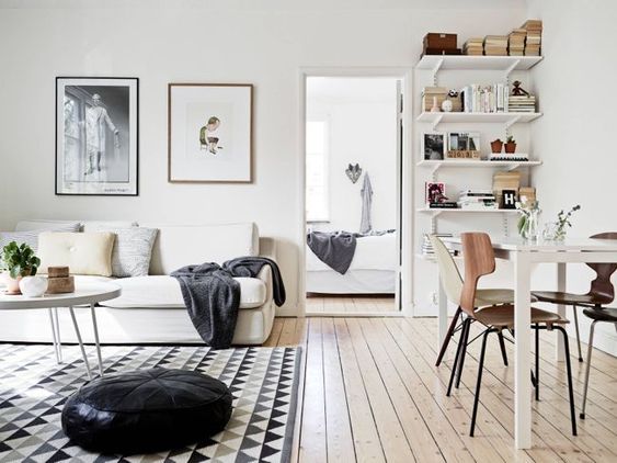 - Il bianco. La regola numero uno per arredare una casa in stile scandinavo è la scelta del bianco come colore dominante, sia per quanto riguarda le pareti, sia per l’arredamento e i complementi. Sono ammesse anche tutte le gradazioni di colori neutri in modo da evitare uno spiacevole effetto ospedale, attenzione però a non esagerare: lo stile nordico prevedere un massimo di tre colori da abbinare per ogni ambiente. La palette di colori naturali puoi utilizzarla per il tessile (divani, cuscini e tappeti). Lo stile scandinavo più moderno utilizza molto il nero per i dettagli a contrasto con il bianco, magari le gambe di un tavolo in cucina o nel living o ancora le cornici di foto e stampe a muro. Infine anche alcuni colori pastello (giallo, rosa, salvia) stanno diventando comuni nello stile nordico, riservati ad alcuni complementi d’arredo.