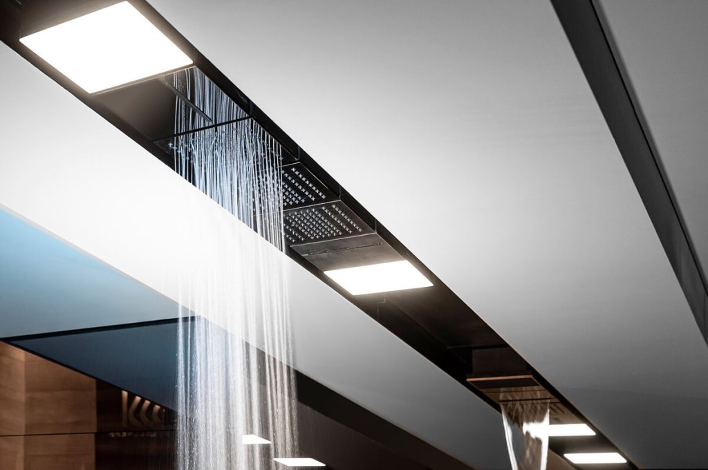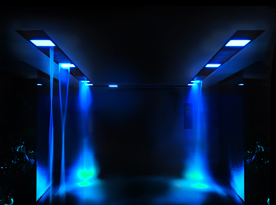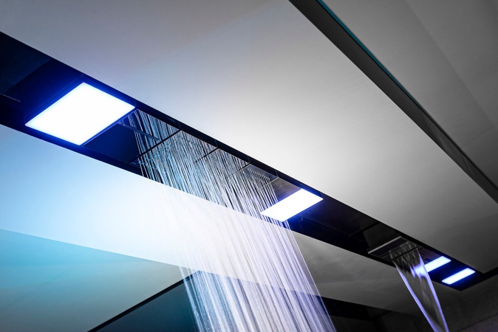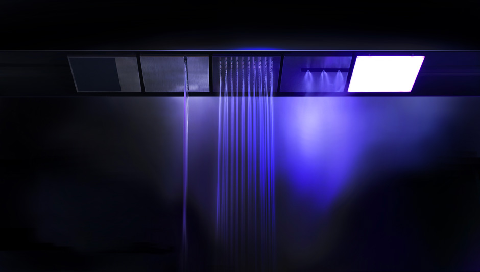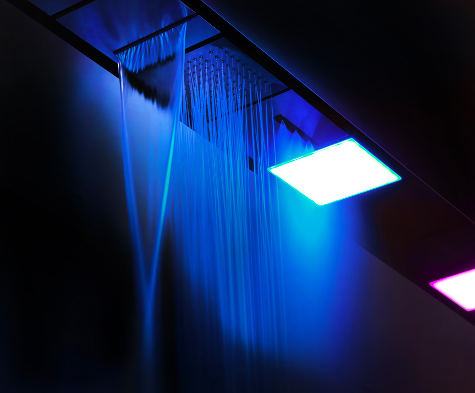 Attraverso un sistema modulabile completamente a scomparsa nel soffitto, viene trasformata la natura dell’acqua a seconda delle varie necessità. Come in una fonte l’acqua scaturisce da un unico punto e assume la forma delle diverse posizioni selezionate: cascata, pioggia, nebulizzata. Alle diverse tipologie di getto puoi abbinare anche la cromoterapia con differenti giochi di luce e la musica, per un’esperienza di benessere totalizzante.
