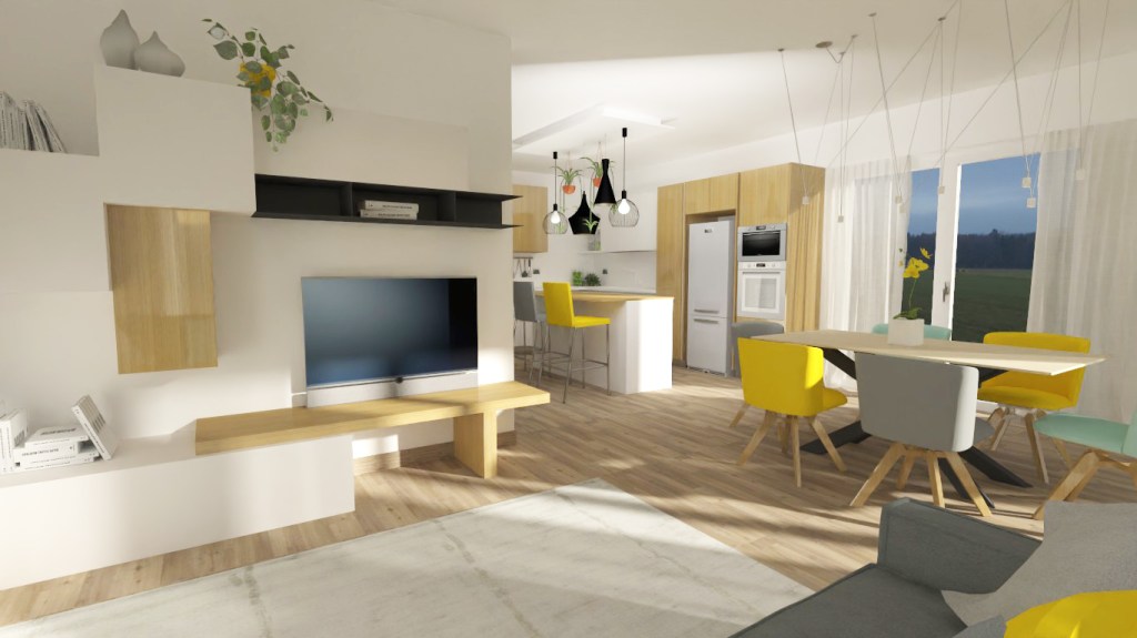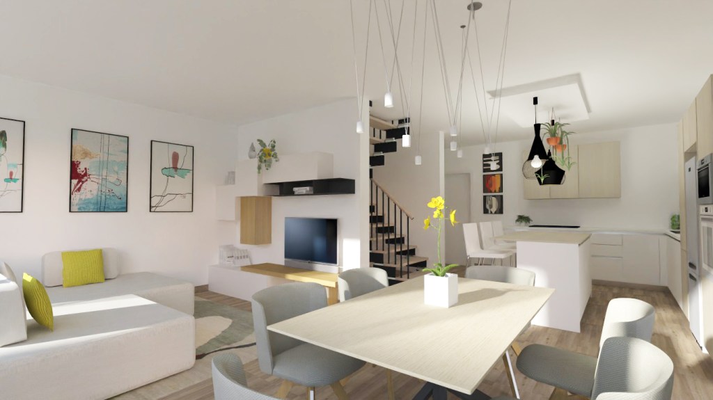 La cucina è stata posizionata nell’angolo interno della stanza in modo da avere ampie pareti su cui disporre comodamente i mobili per creare lo spazio contenitivo necessario ad una famiglia di quattro persone. La zona pranzo e il salotto invece sono stati posizionati sul perimetro esterno, caratterizzato dalle grandi vetrate sul giardino.