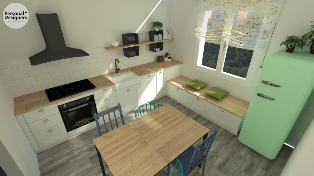 Lo stile generale della casa doveva essere di ispirazione vintage, in particolare sognavano una cucina con anta a telaio senza pensili, piastrelle diamantate e soprattutto un grande lavello in ceramica. Il tutto però animato da colori vivaci nelle tonalità prevalentemente dell’azzurro e del verde, per dare quel tocco fresco e leggero adatto ad una coppia di venticinquenni.