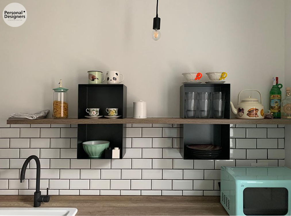 Per ovviare alla loro mancanza abbiamo deciso di inserire una mensola con dei vani metallici, che richiamano la cappa di design.